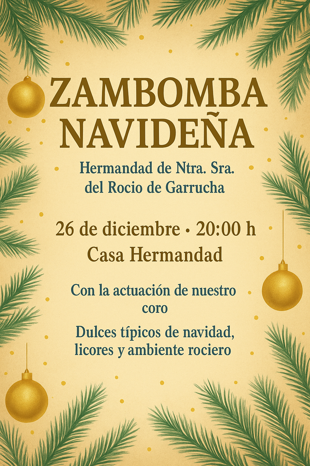 La Hermandad del Rocío de Garrucha celebra su Zambomba Navideña el 26 de diciembre a las 20:00 h en la Casa Hermandad, con villancicos, dulces y ambiente rociero.