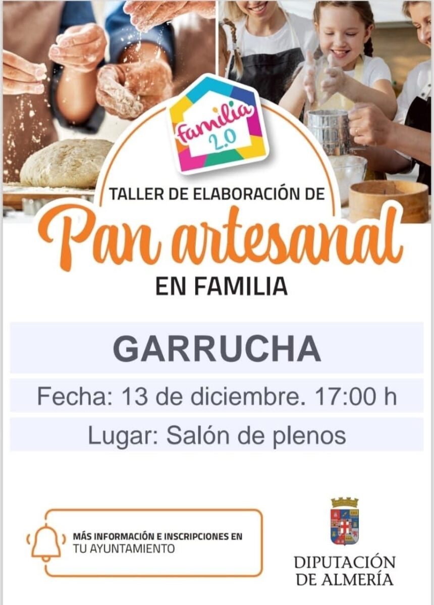 El Ayuntamiento de Garrucha, en colaboración con la Diputación de Almería – Área de Familia, organiza un taller de elaboración de pan artesanal en familia, una actividad pensada para que los más pequeños aprendan, experimenten y disfruten junto a sus padres o tutores.